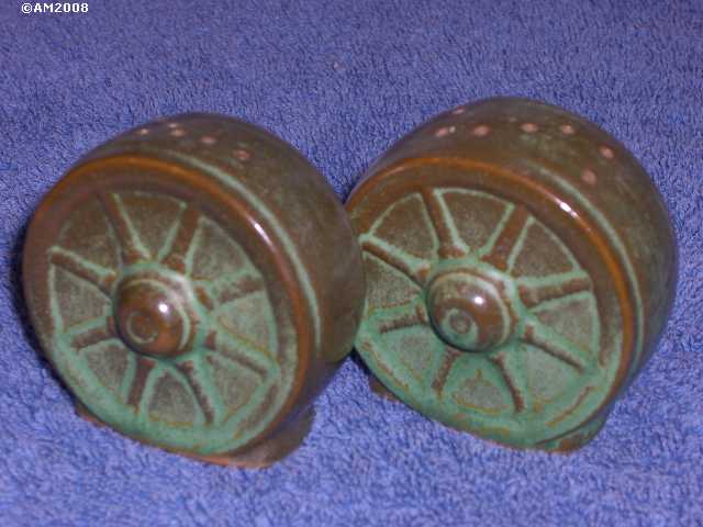 94H Wagon Wheels, prairie green glaze. S7/P6 holes set, crude "S" group. This is how the very first Wagon Wheels shakers looked.