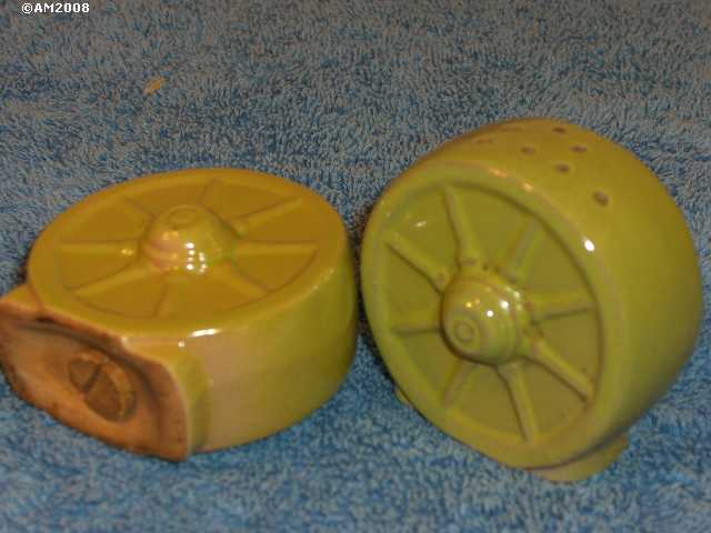 94H Wagon Wheels, lime green glaze. S7/P7 hole set, double diamond group. The clay is Ada, but the glaze is not a listed glaze. I have heard reports of other Wagon Wheels items in this color also called celery. In 2009 I acquired the matching cream and sugar set shown below. Perhaps Frankoma produced them as a set. In any case the glaze is extremely rare.