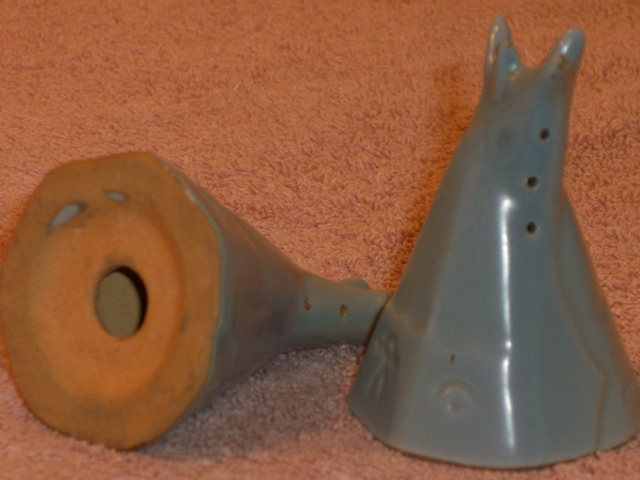 47H Tepees, clay blue glaze, 3/2 hole set, no base marks. This unusual Type 2 set offers clay blue glaze introduced in 1953 on Ada clay in its last year of use.