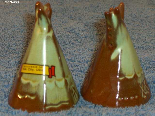 47H Tepees, prairie green glaze, 4/3 hole set. Nice Type 3 pair showing the rutile glaze contrast of the late 1950's.