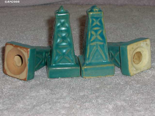 49H Oil Derricks, turquoise glaze. Both of these pairs could be confused as being Type 1 or Type 2. The glaze is nearly the same (the left glaze is more opaque) although some reference sources say the 1942 turquoise is different from the 1951 turquoise. The key is in the plug depressions. Despite being on a red Ada clay the pair on the left is the older Type 1 from the early post-fire era. The plug depression is shallow and rounded. The pair on the right is the Type 2 from about 1951. The plug depression is deeper and has sharp edges. This very light Ada clay appears in non-dinnerware shakers from about 1948-1952. Sometime in the early post-fire era of 1940-1943 Frankoma made several shapes of shakers glazed turquoise and fired on this red Ada clay.