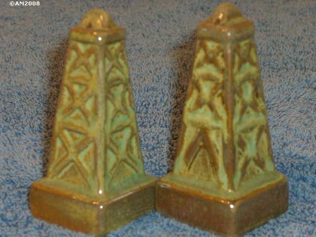49H Oil Derricks, prairie green glaze, 2/2 hole set, Type 2. Well matched glaze and clay with equal number of holes.