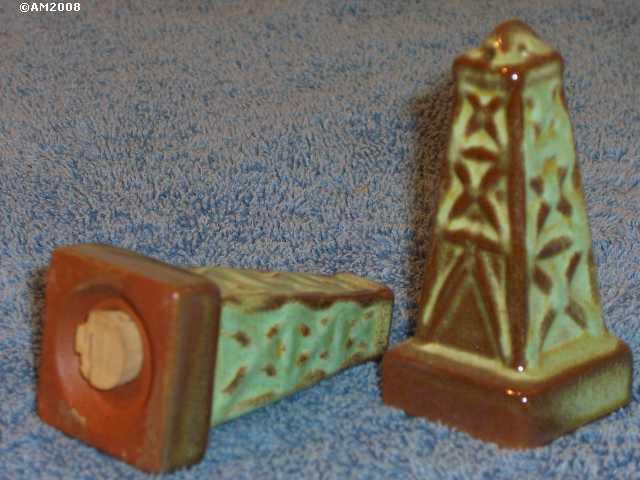 49H Oil Derricks, prairie green glaze, 4/2 hole set, Type 3. Here is a good look at the Sapulpa clay of the late 1950's. Note the precisely shaped plug depression of the Type 3 shakers.