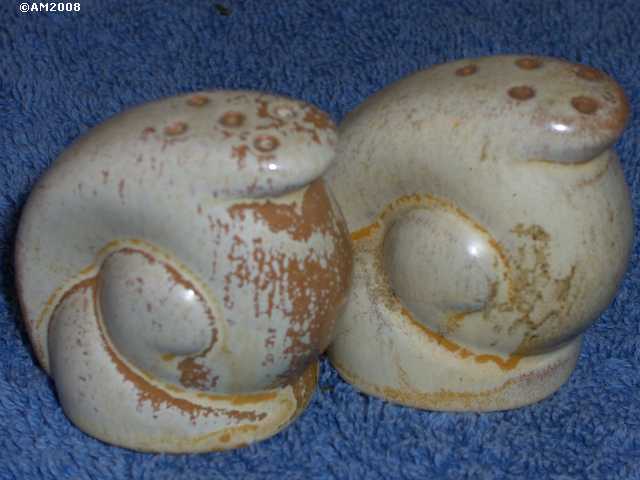 558H Snails, desert gold glaze, S5/P5 hole set, large size. No marks, Type 2.. āPā is upside-down as with most of the Snails produced after 1948.
